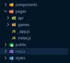 Сите други директориуми се прикажуваат во frontend. На пример во /components се работи со React.js компоненти. Redux е за state-managment. Во /pages/games има endpoints кои се прикажуваат на frontend.