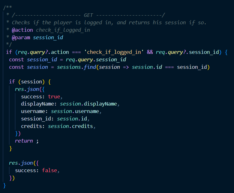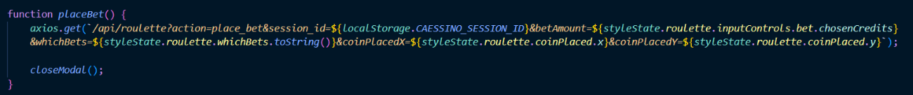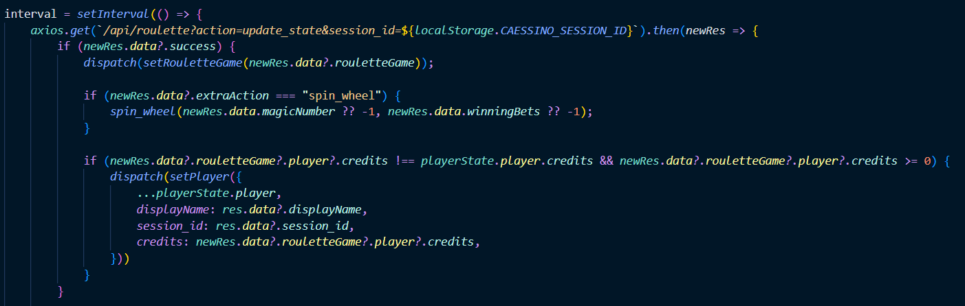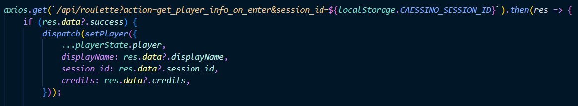При пристигнување на /games/roulette, најпрво од клиентската страна кај играчот се испраќа GET request, во кој се дава сесиското ID на играчот. Еве ја функцијата што го прави тоа. При враќање на резултат со статус успешно, на корисникот му се дозволува влез во играта рулет. Ако статусот е неуспешно, се замолува играчот да се најави пред да започне со играње.