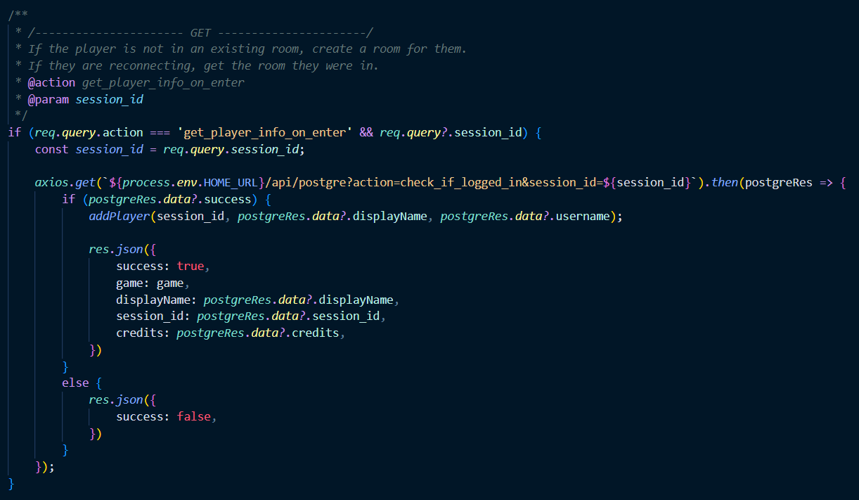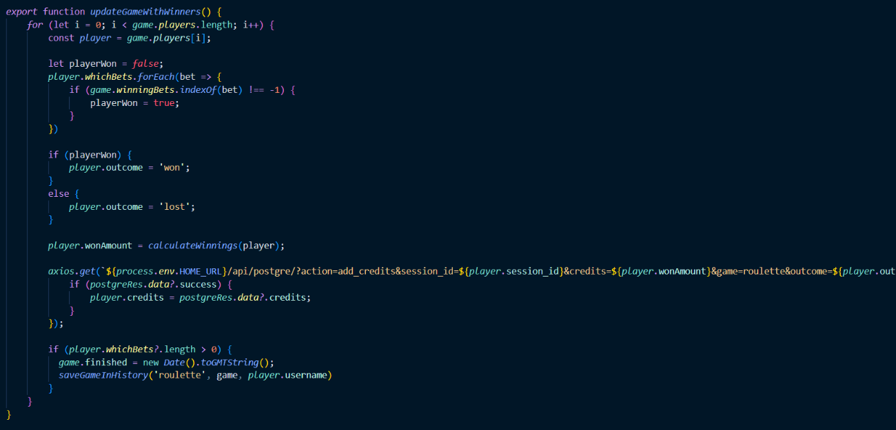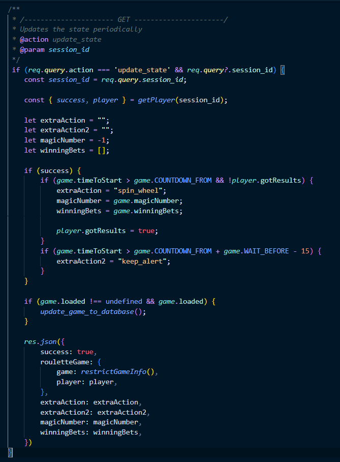 Еве ја функцијата на серверската страна во /api/roulette, што препраќа нов GET request до /api/postgre, каде се чуваат сесиите и каде се контактира со базата на податоци.