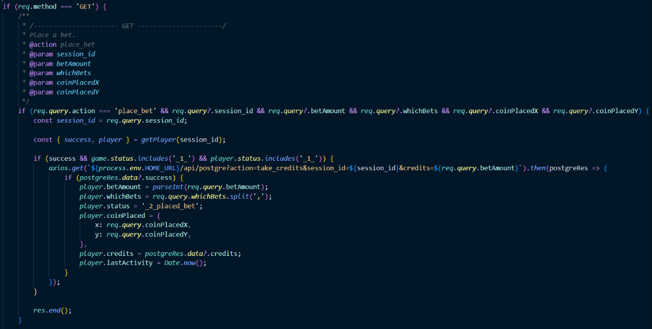 Како ова барање се обработува на серверот е прикажано на следната слика. Да напоменеме дека од овде се испраќа и барање до /api/postgre, каде се контактира со базата на податоци и се враќа информација дали играчот има доволно кредити за да го постави овој залог.