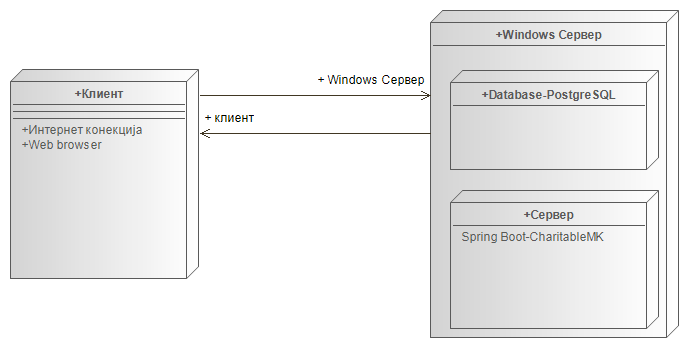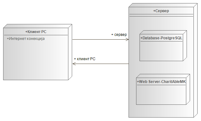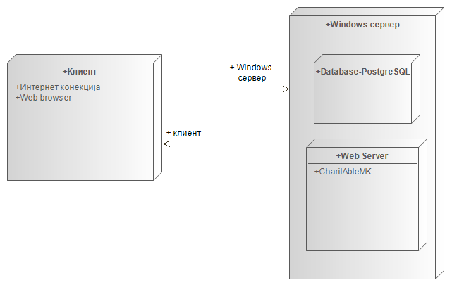 За ваков тип на веб апликација, најсоодветен е моделот клиент-сервер. Од клиентот се очекува да има интернет врска и веб прелистувач на уредот, преку кој ќе се поврзе со Windows-серверот. Базата на податоци ќе биде поврзана со централниот сервер.