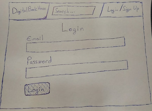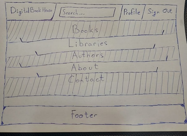 - Почетната страна на сајтот ги прикажува сите главни елементи на целиот проект. Имаме дел за логирање на член и за зачленување, дел “Books” кој не пренасочува во формата за прикажување на сите книги од сите библиотеки кои моментално се достапни во системот, дел “Libraries” кој не пренасочува во формата за прикажување на сите библиотеки кои се дел од системот, дел “Authors” кој не пренасочува во формата за прикажување на сите автори на сите книги кои моментално се достапни во системот, дел “About” кој не пренасочува во страницата со информации за системот, дел “Contact” кој не пренасочува во страницата со информации за контакт. Исто така во долниот дел од скицата се гледа и “Footer”.