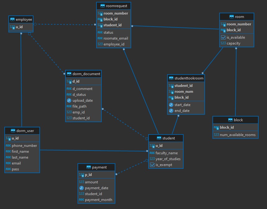 Dorm_Document (d_id, d_comment, d_status, upload_date, file_path, emp_id*, student_id*)