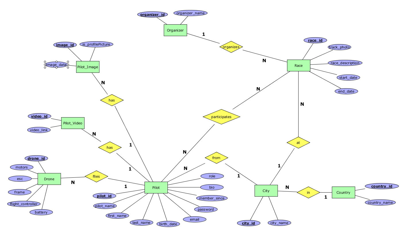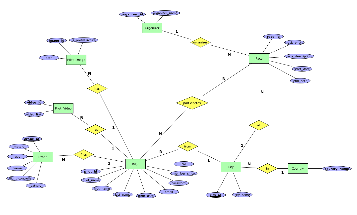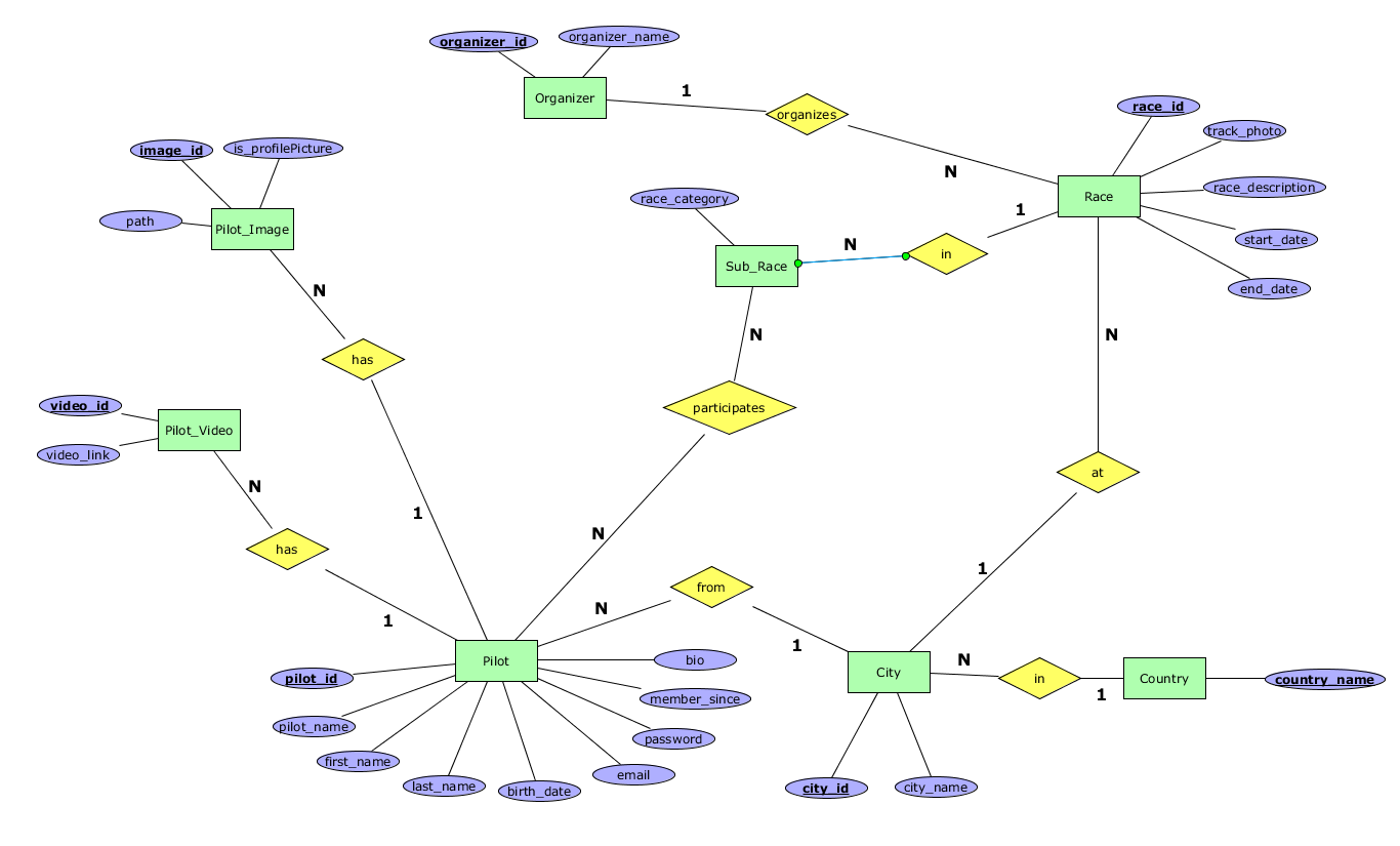 participates - N:N релација помеѓу Pilot и Race, се чуваат записи за кој пилот учествува во која трка