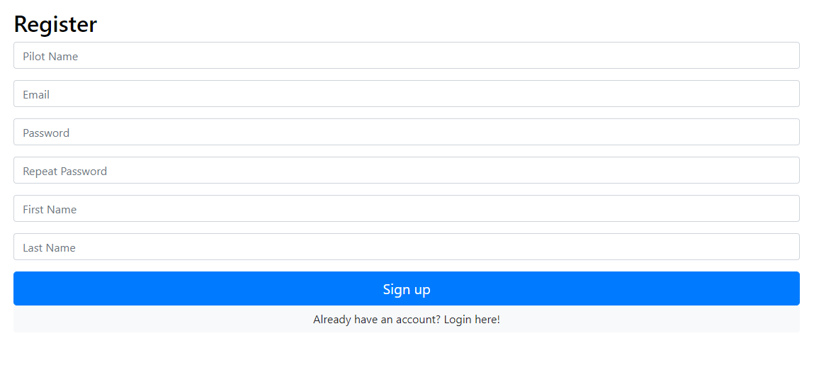 Пилотот ја посетува почетната страна и избира "Register"