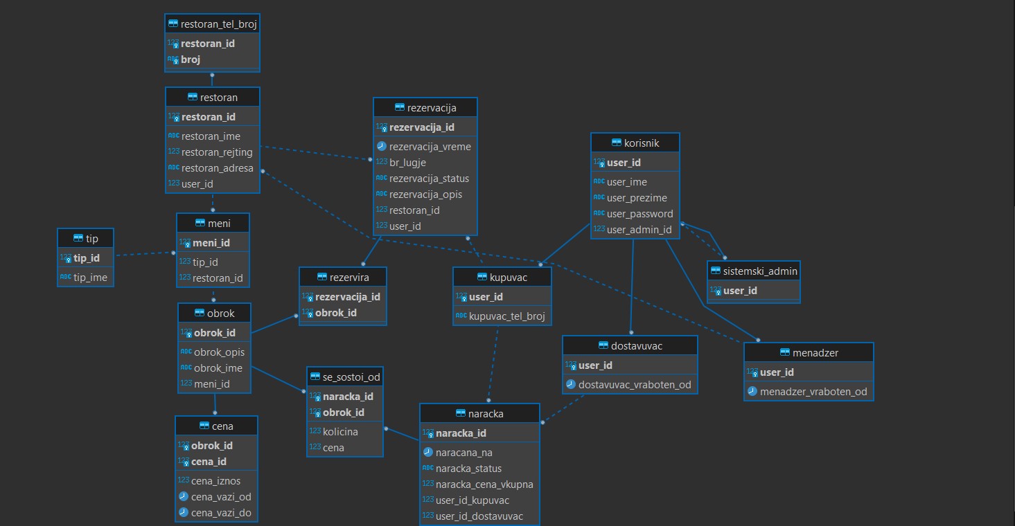 - Restoran(restoran_id, restoran_ime, restoran_rejting, restoran_adresa, user_id*(Menadzer))
