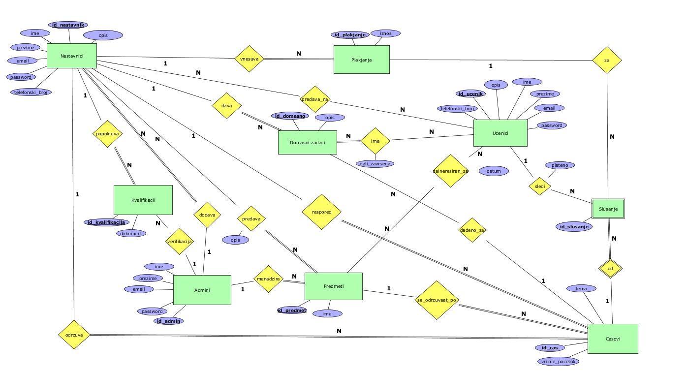 - дадено_за - 1:N релација помеѓу Часови и Домашни_задачи која означува дека едно или повеќе домашни задачи се дадени на точно еден час