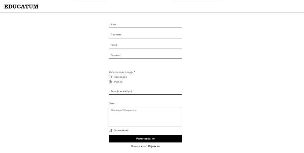 Нека корисникот во претходниот чекор избрал опција да се регистрира. Се прикажува форма за регистрација. Корисникот избира да се регистрира како „Ученик“ со селекција на соодветната radio-button опција.