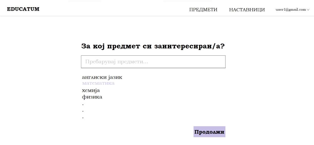 Следува приказ на листа од предмети и search поле за пребарување според име на предмет. Корисникот избира предмет за кој е заинтересиран (во случајот на сликата, го избира предметот „математика“ кој е со виолетова боја на hover). Линкот води до страна со приказ на наставниците по предметот.