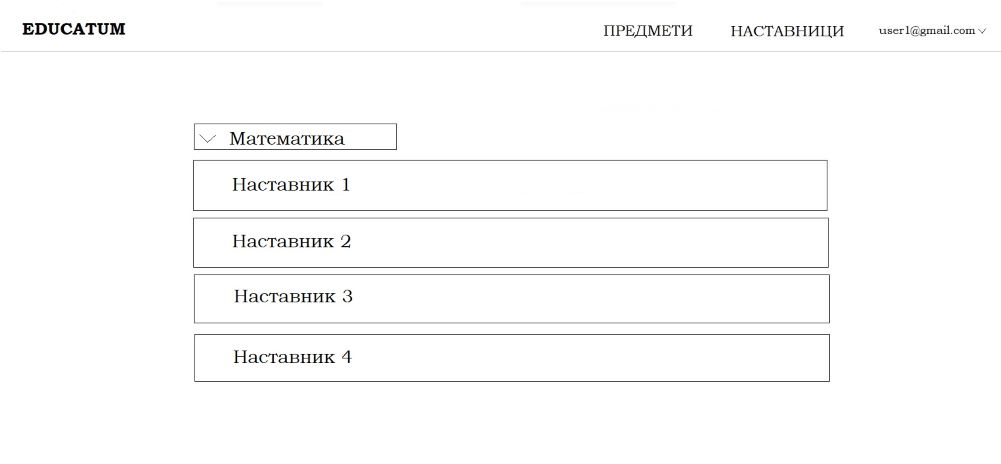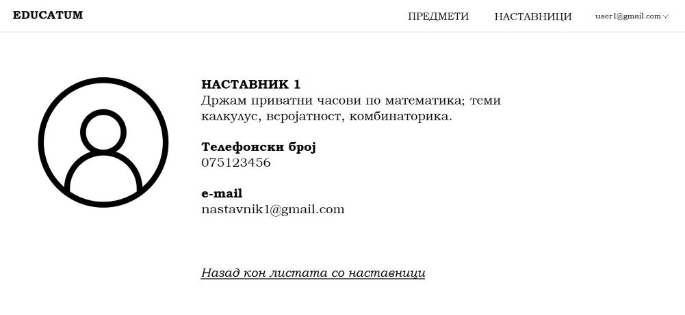 За избраниот предмет се прикажува листа од наставници кои држат приватни часови по предметот. Корисникот кликнува на Наставник1.