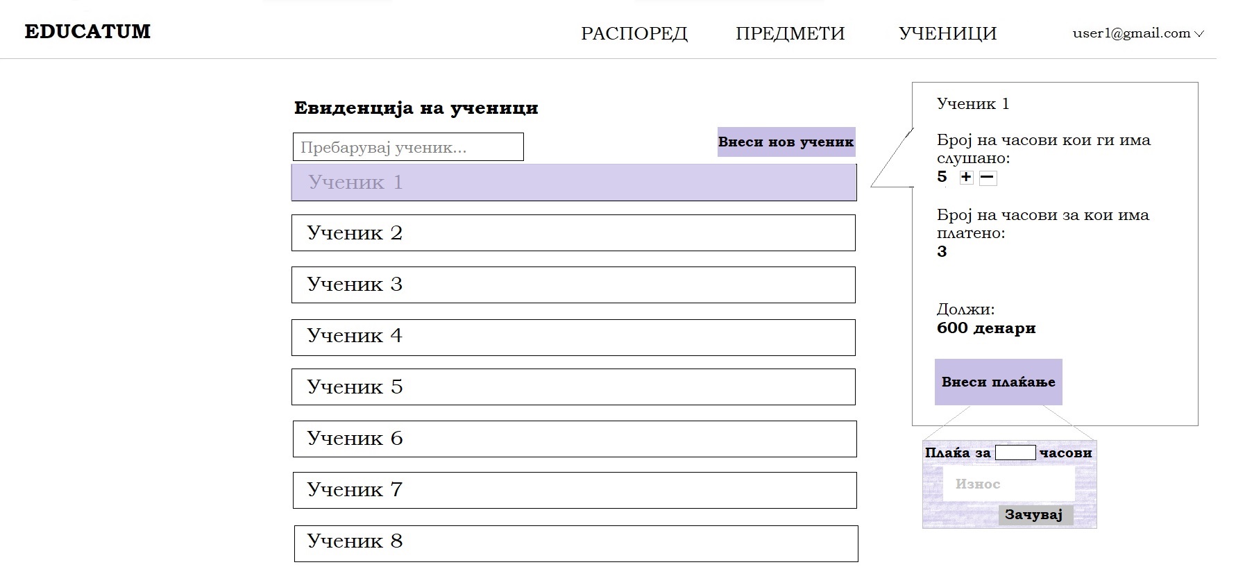 По најавата, на екранот се прикажува листа од сите ученици на кои наставникот им предава. Целта на ова е детален увид на учениците и плаќањата. Со селекција на item од листата (во случајот на сликата селектиран е Ученик 1), се прикажуваат следните информации: колку часови има слушано, за колку часови има платено, колку изнесува сумата што треба да ја плати, копче „Внеси плаќање“ на чиј клик се отвора дијалог прозорец. Во дијалог прозорецот наставникот треба да внеси за колку часови плаќа ученикот и износ. Со клик на копчето „Зачувај“ податоците се ажурираат.