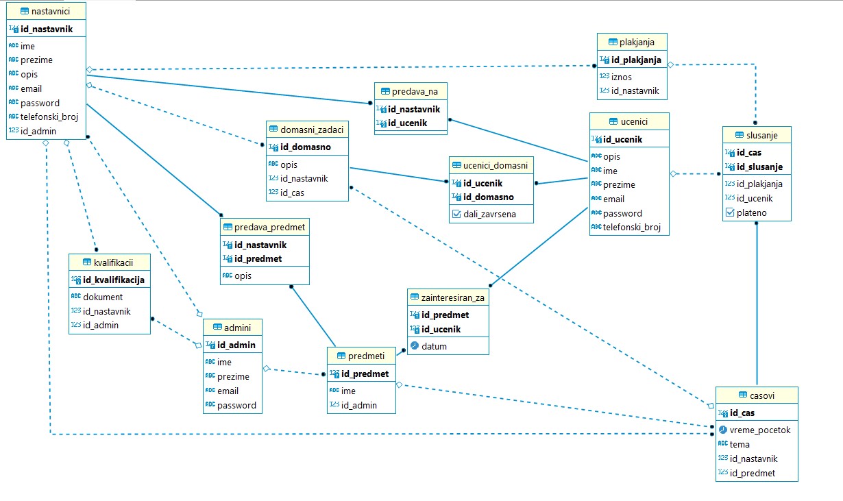 - Ucenici(id_ucenik,opis,ime,prezime,email,password,telefonski_broj)