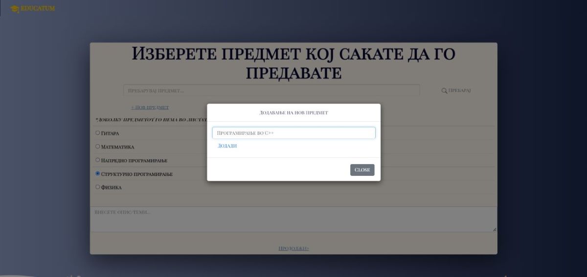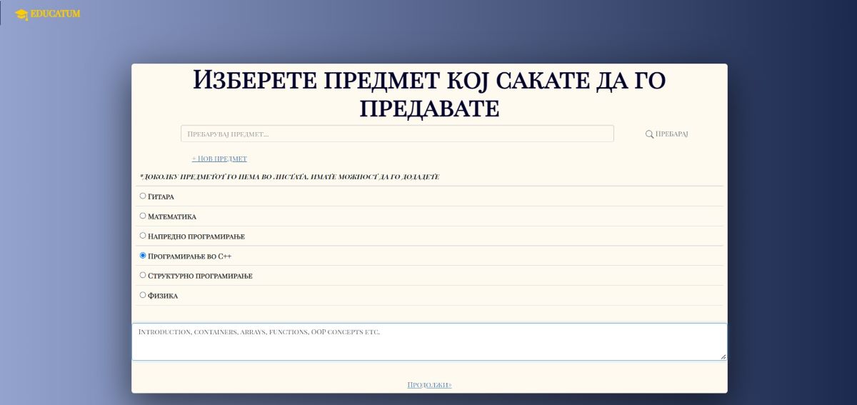 -- Со избирање на корисникот дека ќе продолжи како наставник, му се прикажува форма каде што се прикажани сите предмети што си содржи апликацијата, каде што ќе избере кој предмет сака да го предава, и да внеси опис за истиот.