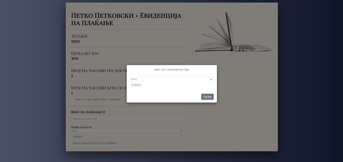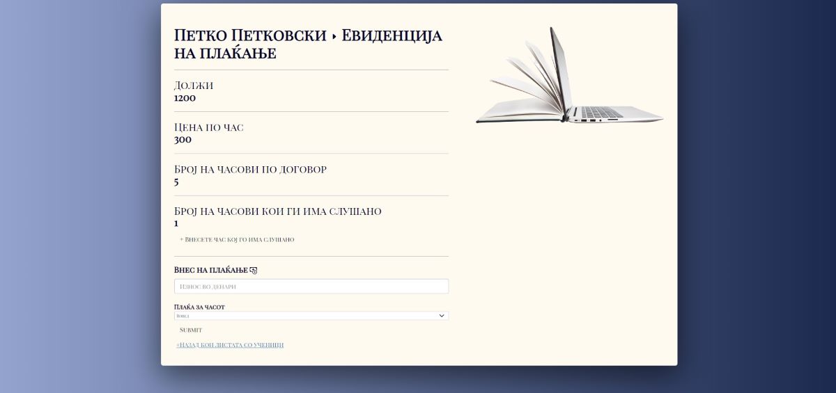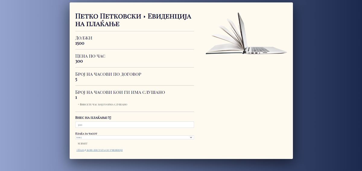 -- Една од главните функционалности на апликацијата беше евиденцијата на плаќање, каде што ја контролира самиот наставник за секој ученик посебно. Кога ќе ги додаде учениците и часовите, наставникот со избирање на даден ученик од листата ученици има можност да виде колку должи, која била цената договорена за секој час и колку часови се договориле, како и можност за број на часови кои веќе ги има слушано ученикот. Кога ќе се одржи часот наставникот може да го додаде на +Внесете час кој го има слушано, како и да може да води евиденција за наплаќањето на часовите, вметнувајќи колку платил ученикот и за кој час плаќа.