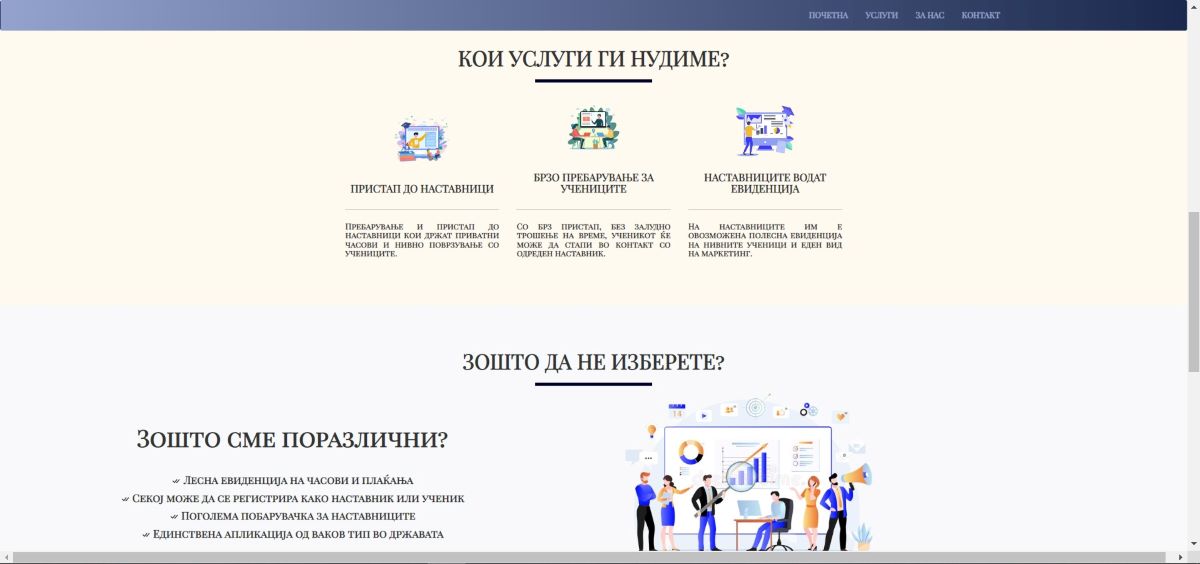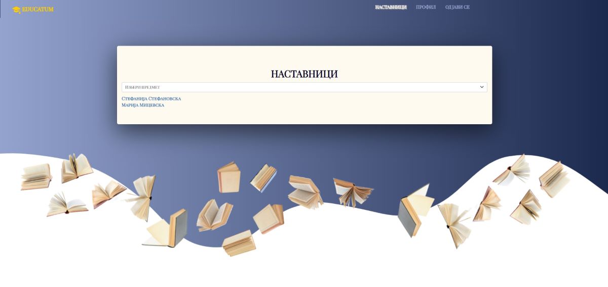 -- Кога ќе избере соодветен предмет и продолжува, му се прикажуваат сите наставници кои држат приватни часови за тој предмет. Исто така и ученикот после најавата на системот има можност за преглед на наставници, како и опција од мени панелот за да може да си го виде и измени својот профил.