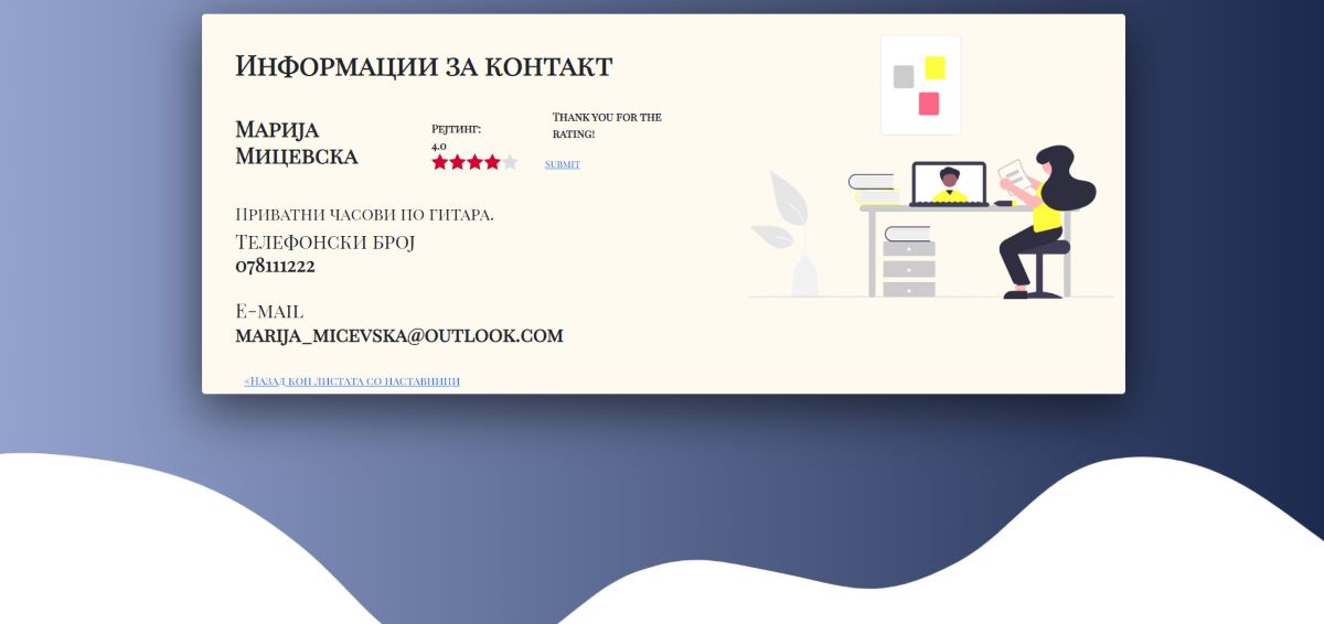 -- Со избирање на еден од наставниците има можност да пристапи до неговиот профил, односно до неговите податоци од каде што треба да ги земен контакт информациите за да се договорат со наставникот. Исто така, ученикот има опција да го оцени професорот кога ќе пристапи до неговиот профил и со тоа му дава дознаење на следните корисници/ученици да гледаат кој професор колку е оценет.