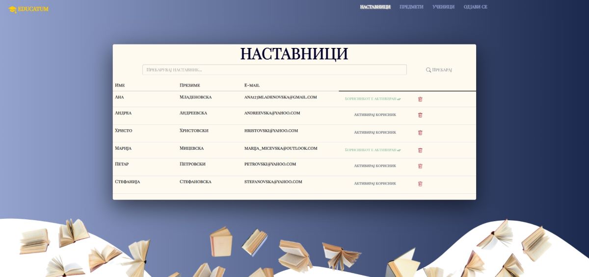 -- За активирање на профилот на корисникот-наставник потребно е админот/квалификаторот, по разгледувањето на информациите и прикачениот документ на наставникот да одлучи дали е соодветен за да го одобри профилот. Доколку одлучи дека е неговите квалификации се во ред кликнува на Активирај Корисник, во спротивно го брише.
