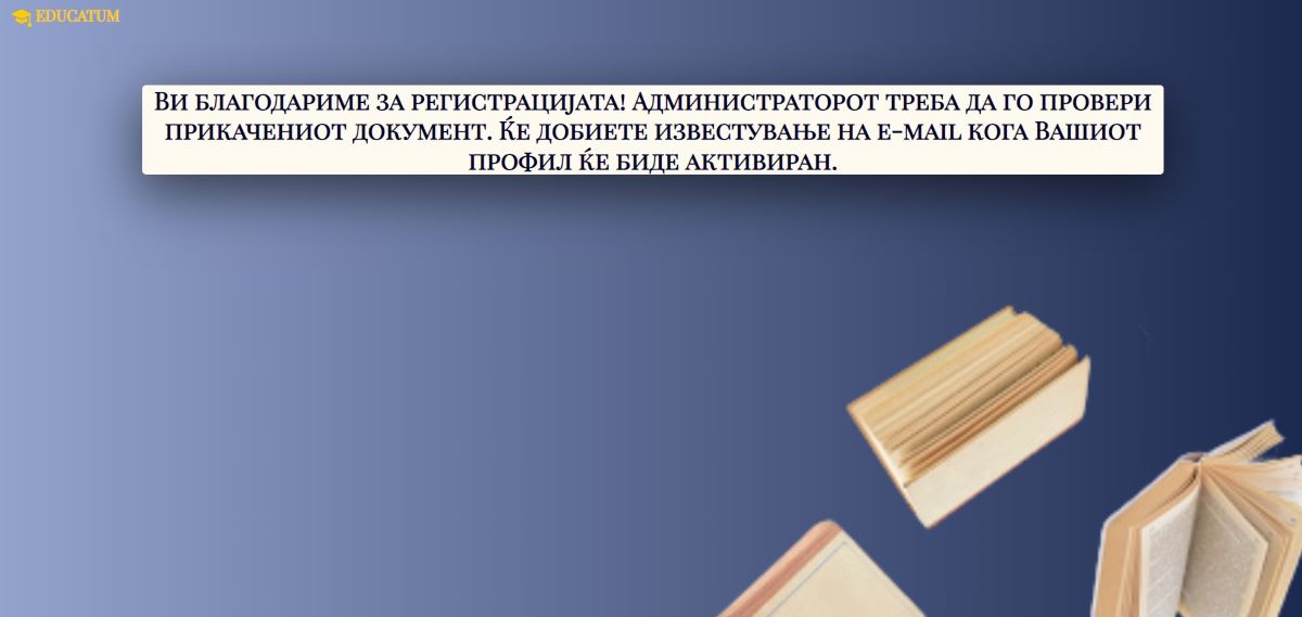 -- За крај на корисникот-наставник му се прикажува следната форма, која кажува дека профилот не е активен и дека ќе биде известен за негова активација.