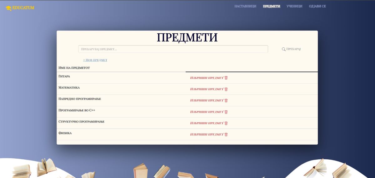 -- Наставникот има мени панел од каде може да се движи на секоја страна соодветно. Кога ќе избере да биде на страната за предмети, има можност да додава предмет за кој сака да предава, да пребарува предемет од листата предмети и да избрише даден предмет.