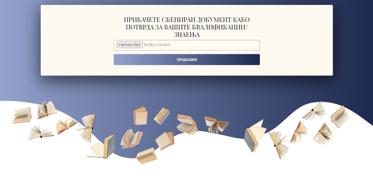 -- По избирањето на предемет корисникот треба да прикачи документ како потврда за неговото знаење. Односно да прикажи доказ дека е соодветен Наставник за тоа што го избрал.