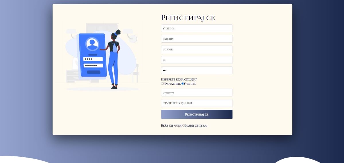 -- Доколку корисникот избере да се регистира како ученик, потребно е да ја селектира radio-button опцијата „Ученик“.