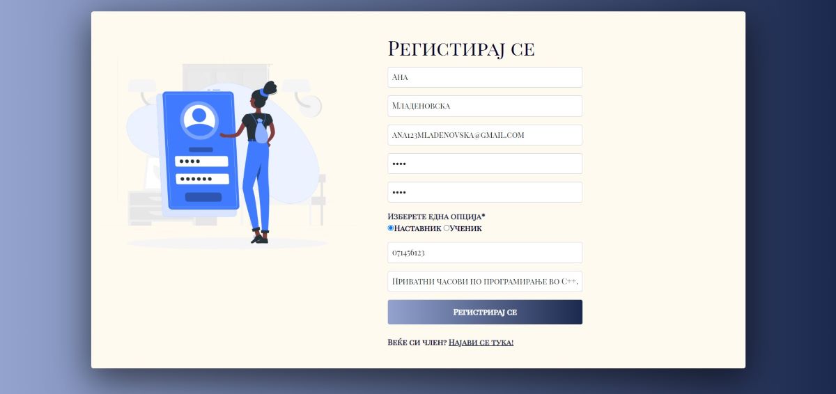 -- Кога корисникот избира на опцијата Регистрирај се, му се прикажува форма која што треба да ја пополни со своите податоци, каде што најбитен чекор е избирањето на неговата задача на апликацијата и тоа дали понатаму ќе продолжи како Наставник или Ученик, бидејќи има разлика. Доколку како на сликата избере Наставник, тогаш следува понатамошно избирање и оставање на податоци.