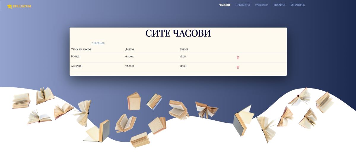 -- По внесувањето на информациите истите се прикажуваат во листата на часови кои ги има наставникот, од каде што може истите и да ги избрише.