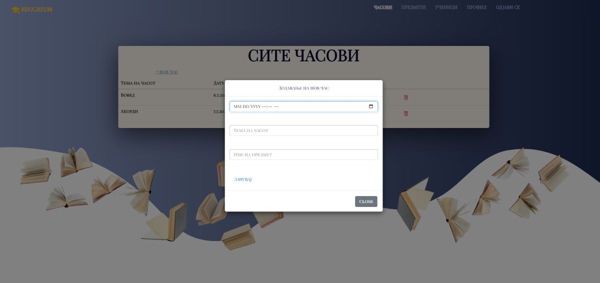 -- Наставникот има можност да ги додава и соодветните часови за секој предмет преку формата каде што внесува датум на доржување, тема на часот и за кој предмет се однесува тој час.