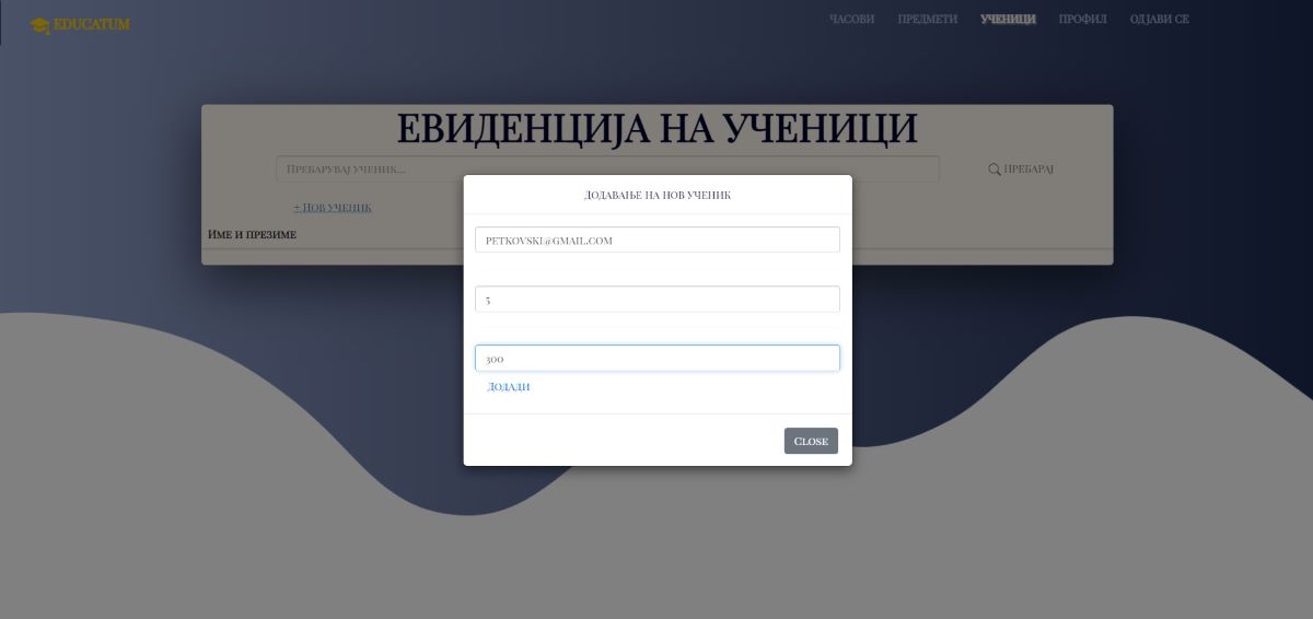 -- Со активирање на профилот и најава на наставникот, може да си додава ученици на формата каде што е потребно да внеси име и презиме на ученикот, број на часови и сума по час. По додавање на ученикот се додава во листата на сите ученици на кои им предава наставникот.