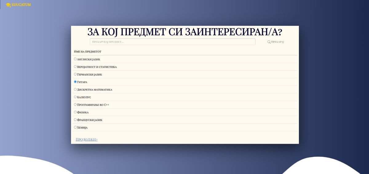 -- Следно му се прикажува страна од каде што треба да избере за кој предмет е заинтересиран/а, односно за кој предмет ученикот бара приватни часови.