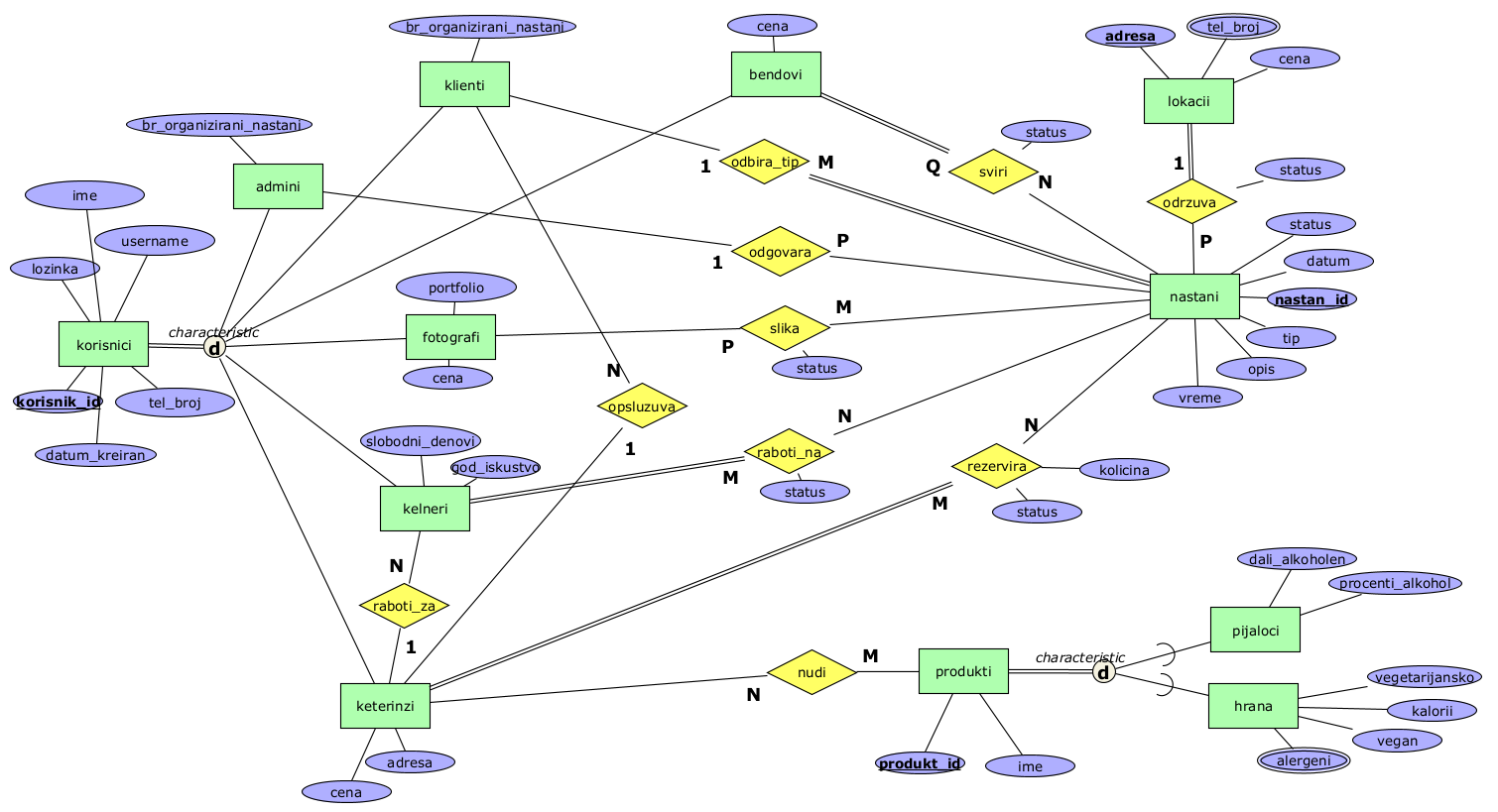 - Korisnici – ентитет од кој произлегуваат ентитетите Admini, Klienti, Fotografi, Kelneri, Keterinzi и Bendovi. Има тотално учество од страна на korisnici, што значи дека корисникот мора да е еден од четирите понудени ентитети. Oвој ентитет ги појаснува сите типови на корисници на системот.