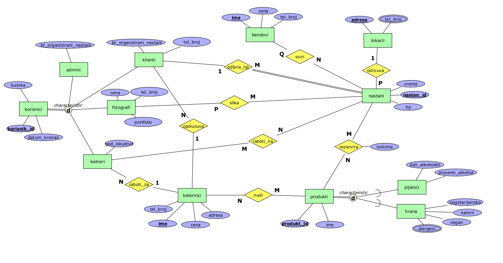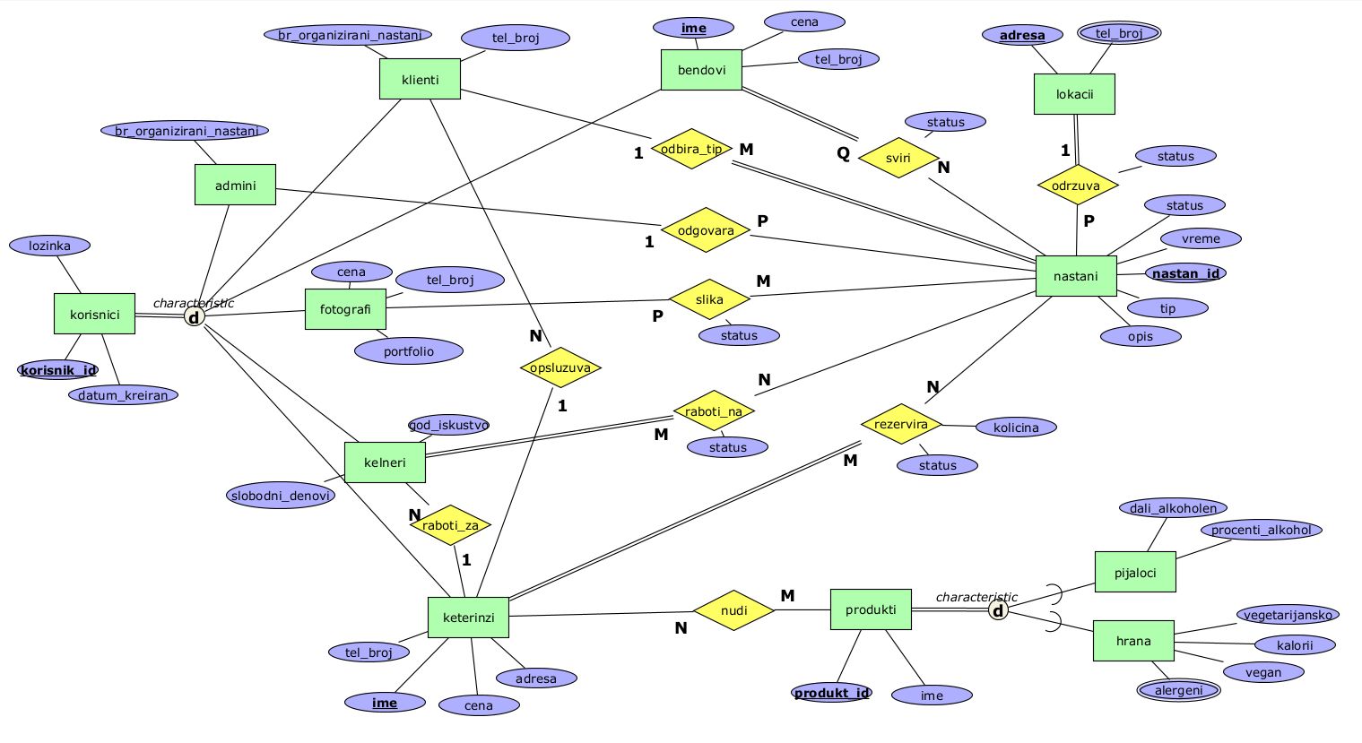 - Korisnici – ентитет од кој произлегуваат ентитетите Admini, Klienti, Fotografi, Kelneri, Keterinzi и Bendovi. Има тотално учество од страна на korisnici, што значи дека корисникот мора да е еден од четирите понудени ентитети. Oвој ентитет ги појаснува сите типови на корисници на системот.