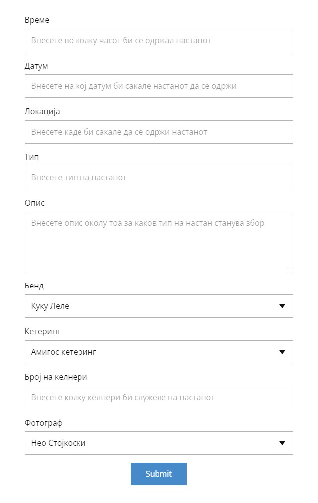 По пополнување на формуларот се испраќа барањето за преглед и се зголемува бројот на организирани настани на клиентот.