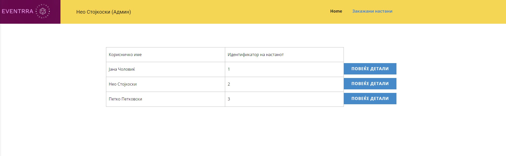 На администраторот му се прикажува табела со сите корисници кои закажале настан. Администраторот притиска на копчето повеќе детали кај еден од корисниците