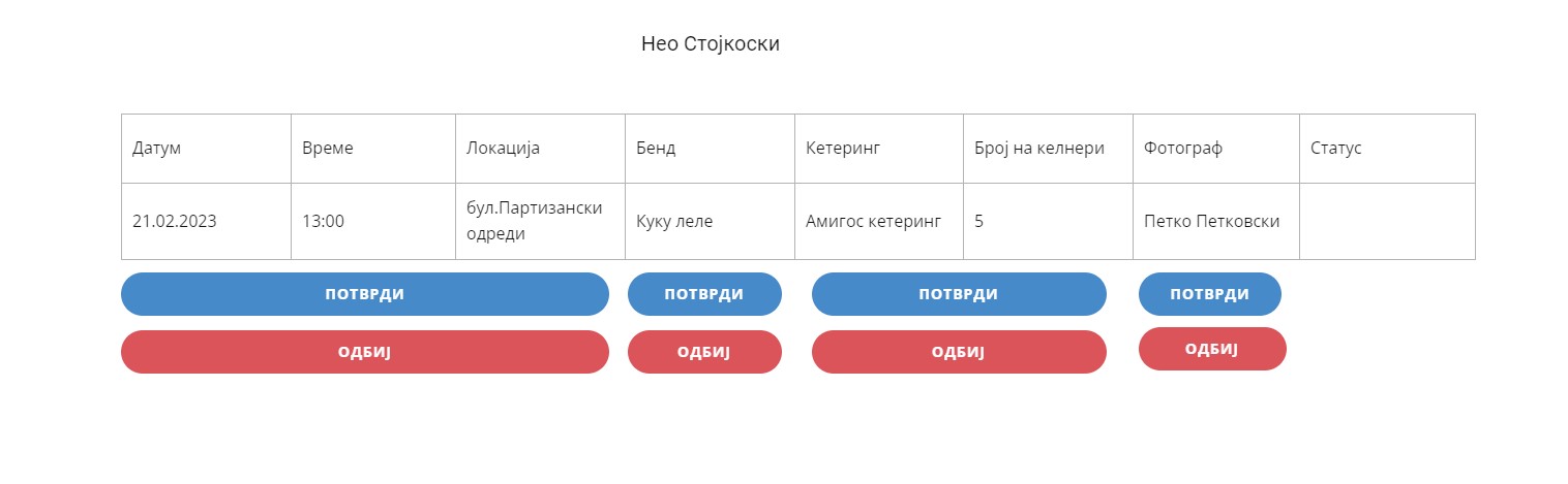 На администраторот му се прикажува детален приказ на сите информации за настанот закажан од корисникот. Администраторот го потврдува/одбива барањето на корисникот за секое поле соодветно.