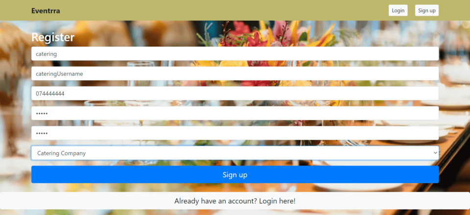 4. По одбирање на улогата на кетеринг, корисникот дополнително внесува цена и адреса