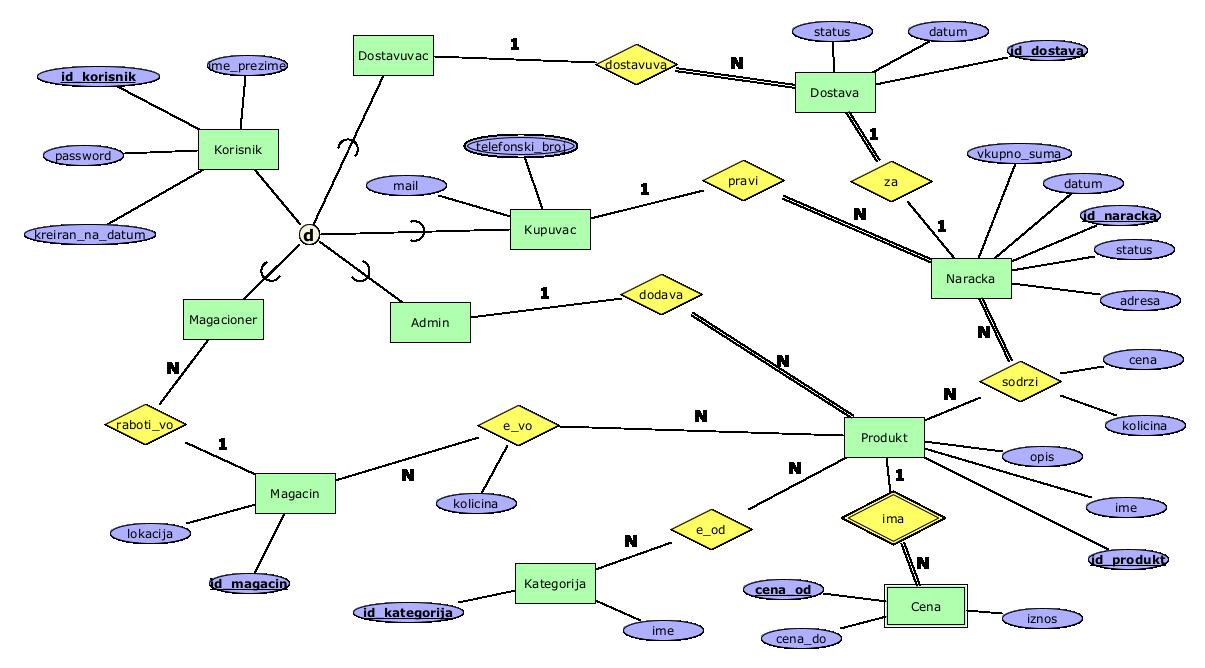 - e vo N:N релација помеѓу Magacin и Produkt - што означува еден продукт во повеќе магацини и еден магацин со повеќе продукти. Содржи и атрибут kolicina.