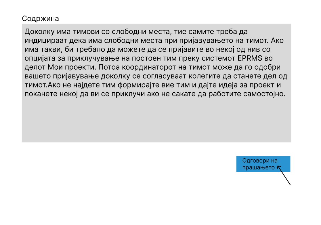 values ('Доколку има тимови со слободни места, тие самите треба да индицираат дека има слободни места при пријавувањето на тимот. Ако има такви, би требало да можете да се пријавите во некој од нив со опцијата за приклучување на постоен тим преку системот EPRMS во делот Мои проекти. Потоа координаторот на тимот може да го одобри вашето пријавување доколку се согласуваат колегите да станете дел од тимот.Ако не најдете тим формирајте вие тим и дајте идеја за проект и поканете некој да ви се приклучи ако не сакате да работите самостојно.',