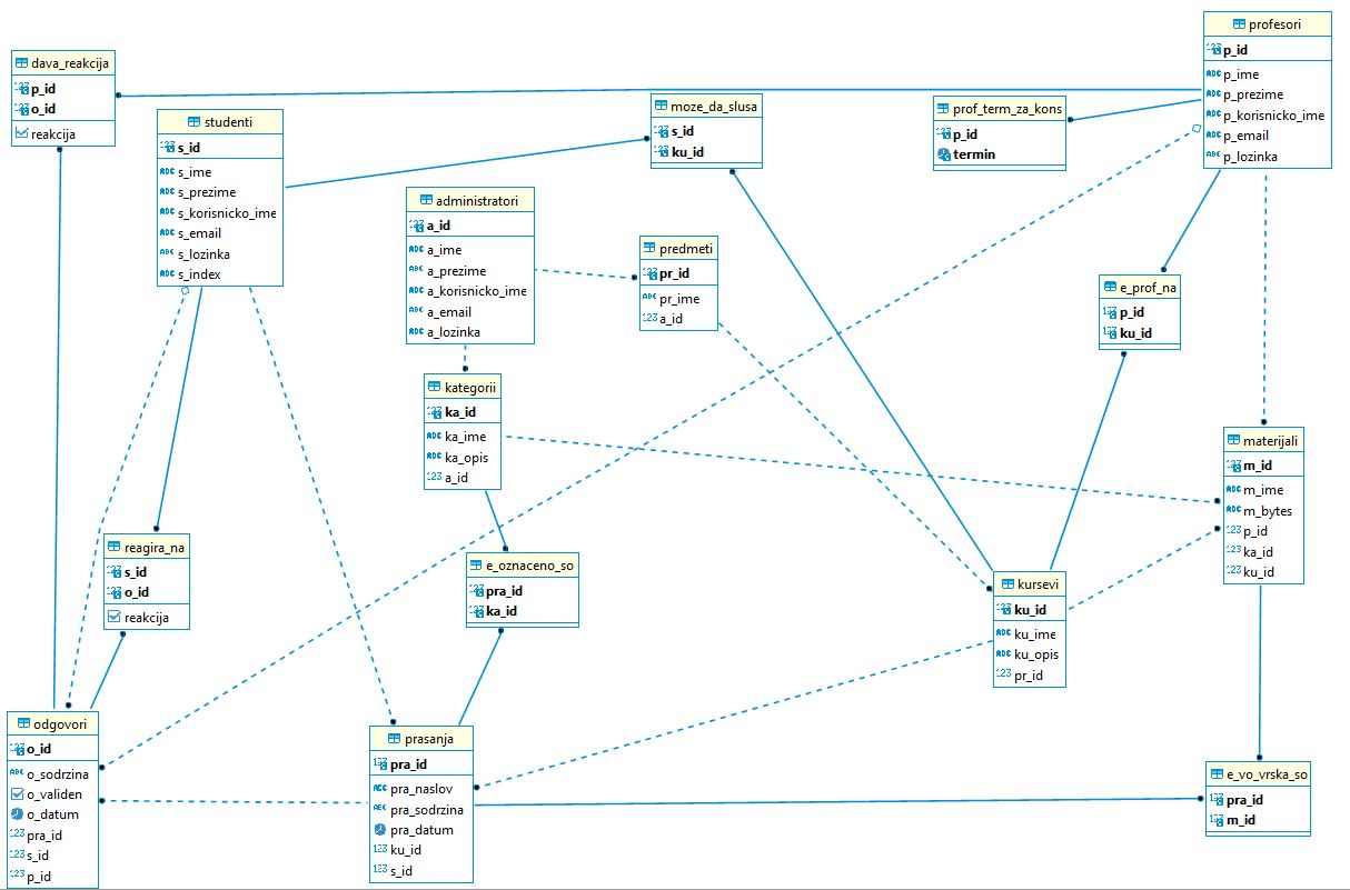 - profesori (p_id, p_ime, p_prezime, p_korisnicko_ime, p_email, p_lozinka)