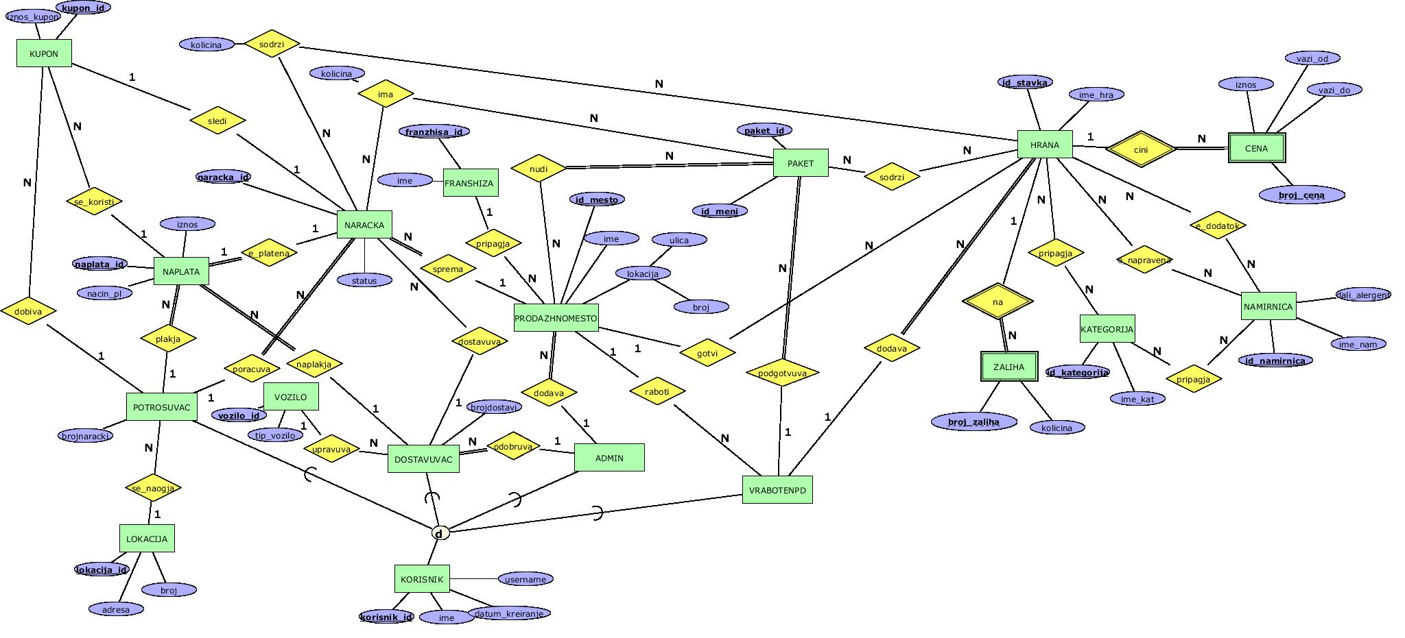 13. NAPLATA - слаб ентитет кој зависи од POTROSUVAC и DOSTAVUVAC, и чува податоците за наплатата која треба да направи доставувачот, а треба да ја плати потрошувачот