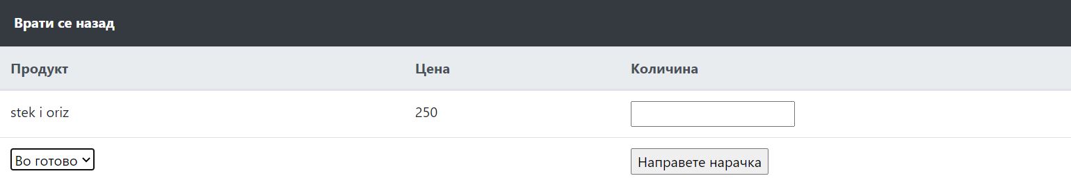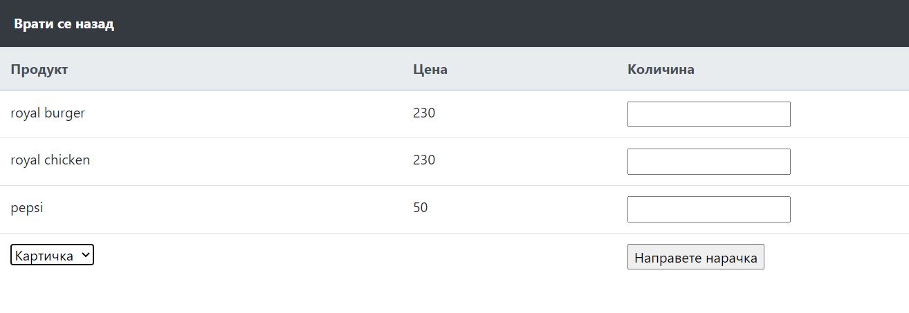 -- Корисникот со избор на некое од продажните места, има преглед од листа од продукти кои продажното место ги нуди. За секој продукт е прикажано неговото име, цена и има поле за внес на количина. Исто така има опција за избор на начин на плаќање, дали "Во Готово" или со "Картичка". По внесување на количината од секој посакуван продукт, корисникот има опција "Направете нарачка" со која се креира нарачка и се испраќа до вработен во продажно место.