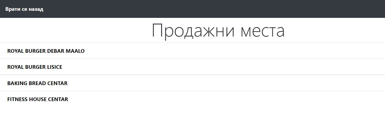 -- Со избор на опцијата "Продажни места" од делот за навигација на почетната страна, корисникот има преглед од сите достапни продажни места на апликацијата. Исто така во делот за навигација има опција "Врати се назад" која го редиректира корисникот назад на почетната страна.