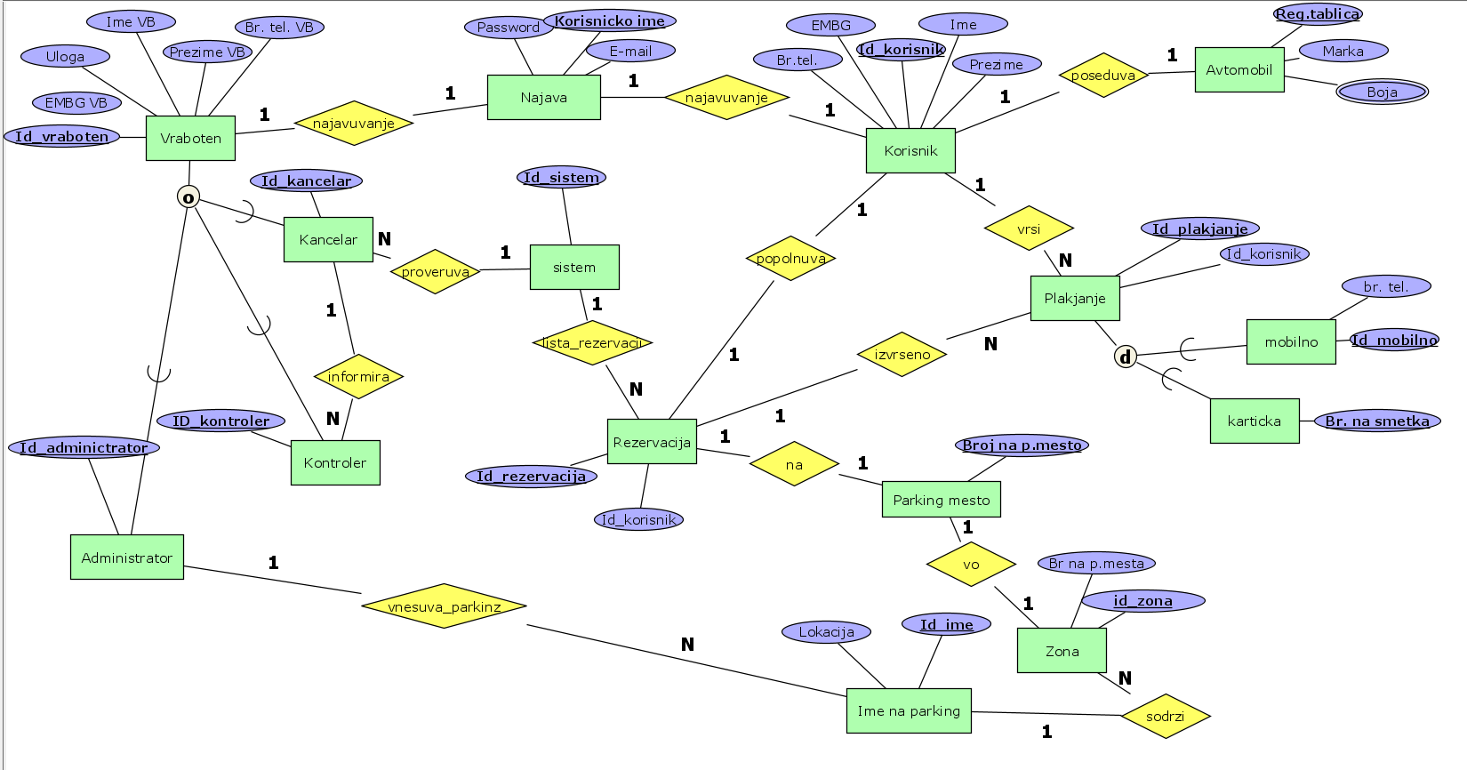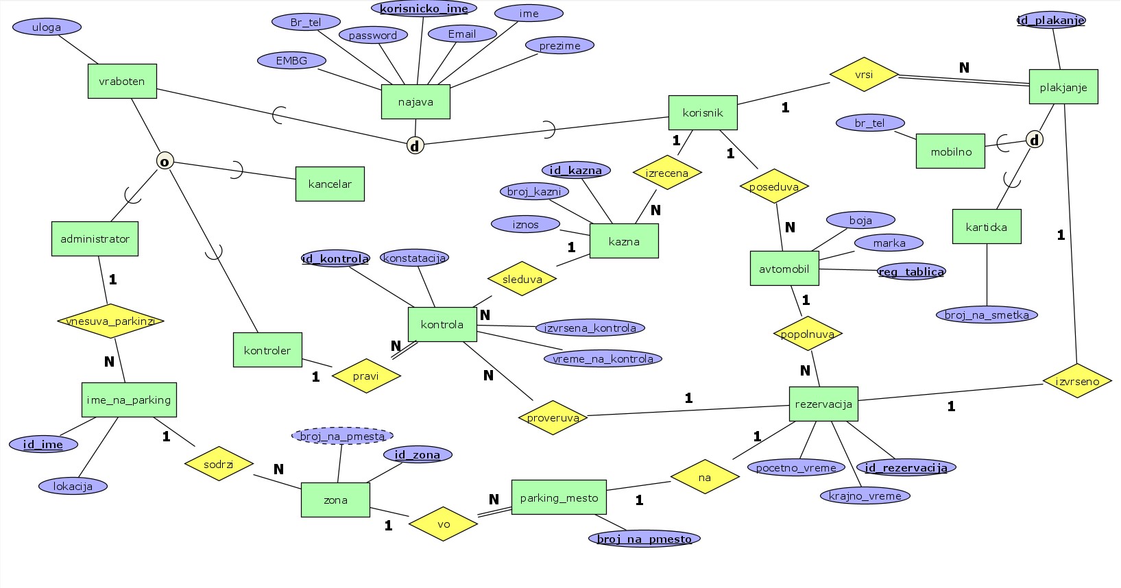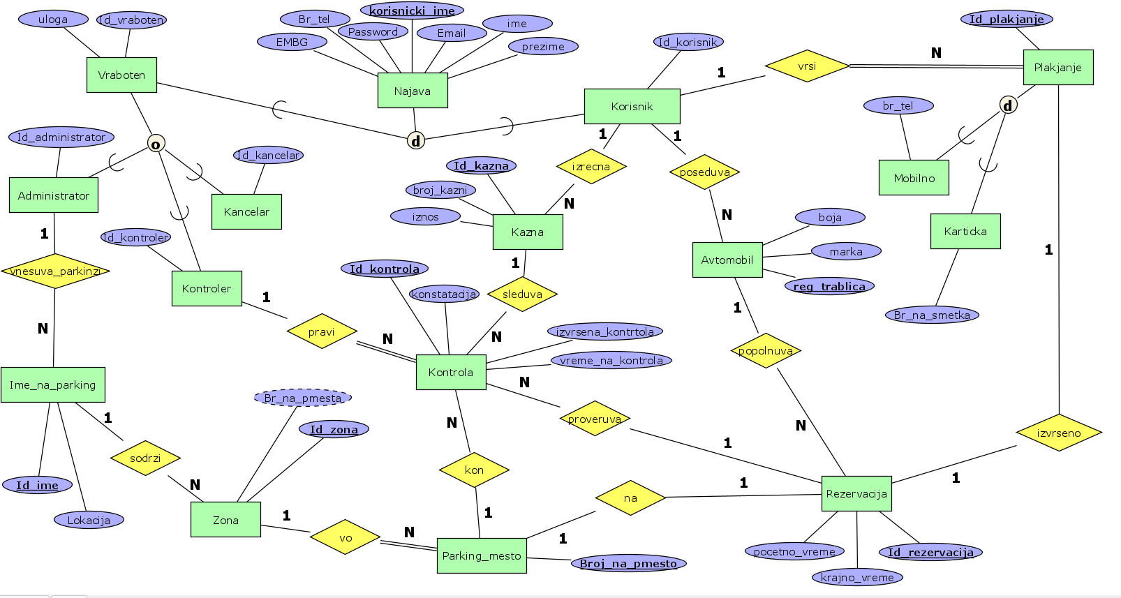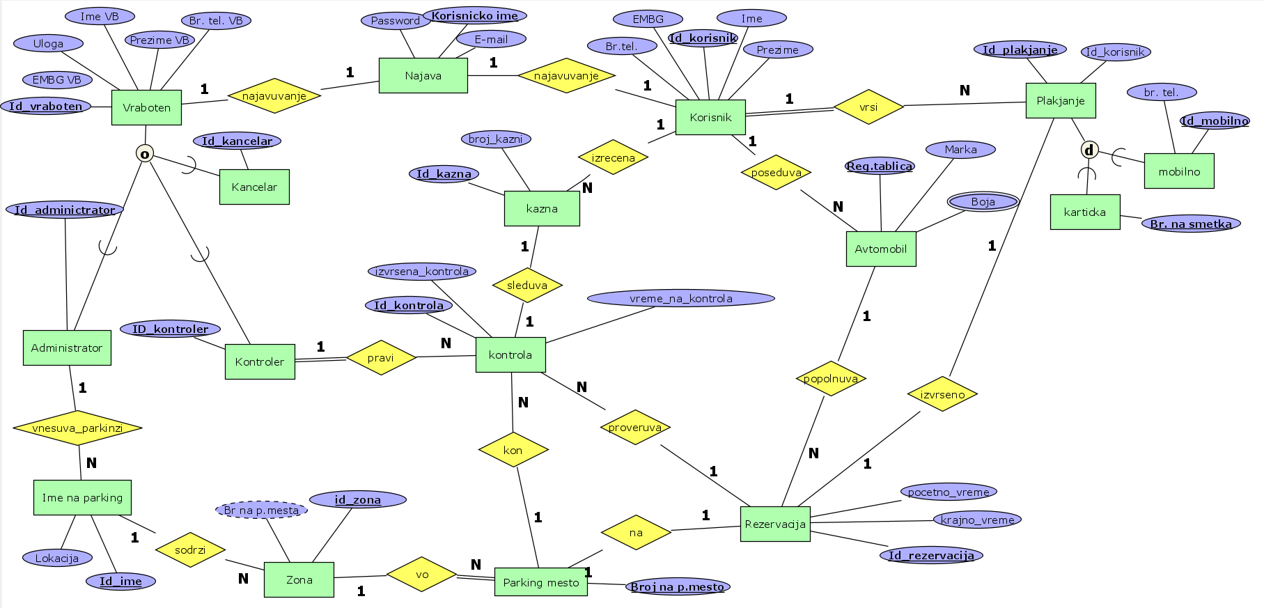 - vnesuva_parkinzi - 1:N, администраторот го одржава системот, односно внесува нови локации на паркинзи, зони и број на паркинг места.