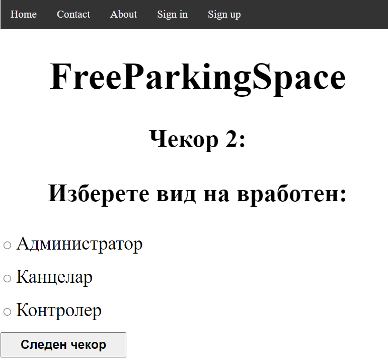 Нека лицето избере дека сака да продложи во регистрацијата како вработен. Тука се појавуват radio-button опции, каде што вработениот мора да избере кој тип на улога ја има.