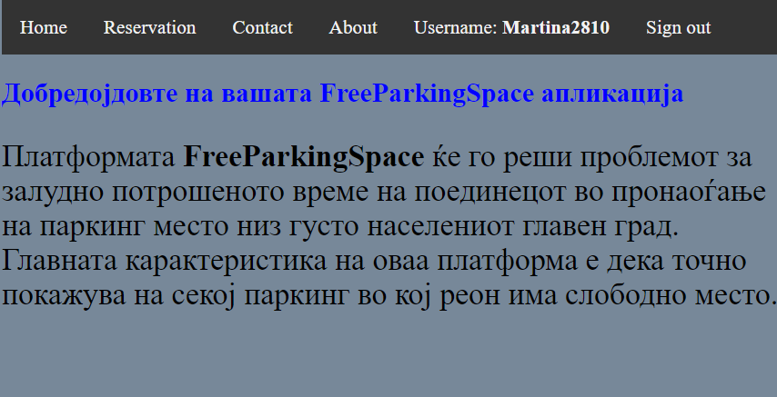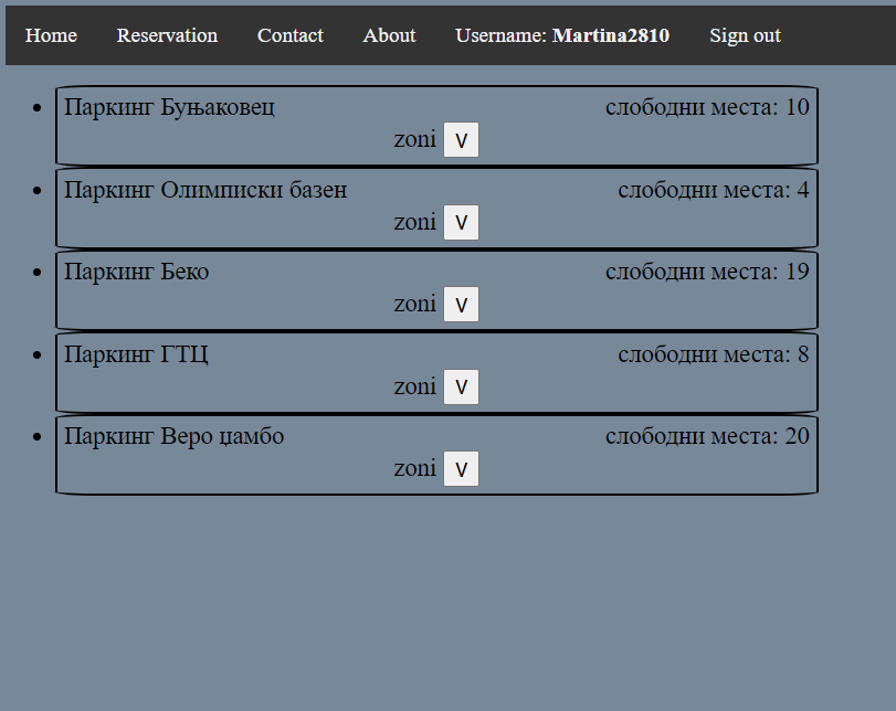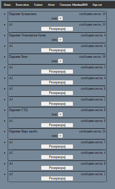 Во резервација се прикажуваат слободните паркинг места во одреден паркинг.