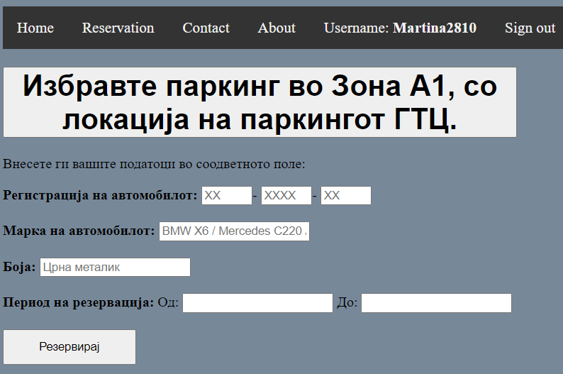 Корисникот откако ќе одбере каде ќе го паркира своето возило, потребно е да внесе регистрација, марка на авотмобил и боја (по желба), и периодот за кој што го резервира тоа место.
