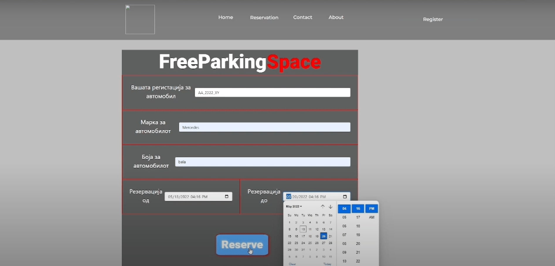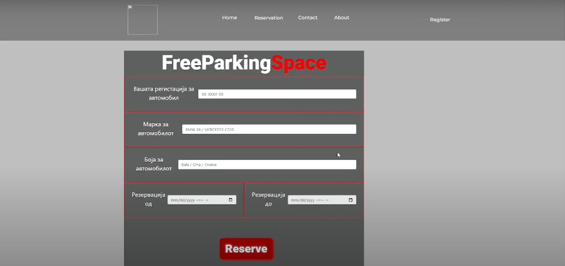 За резервација потребно е да се пополнат сите полиња Регистрација на автомобил, Марка на автомобилот и Боја на автомобилот.