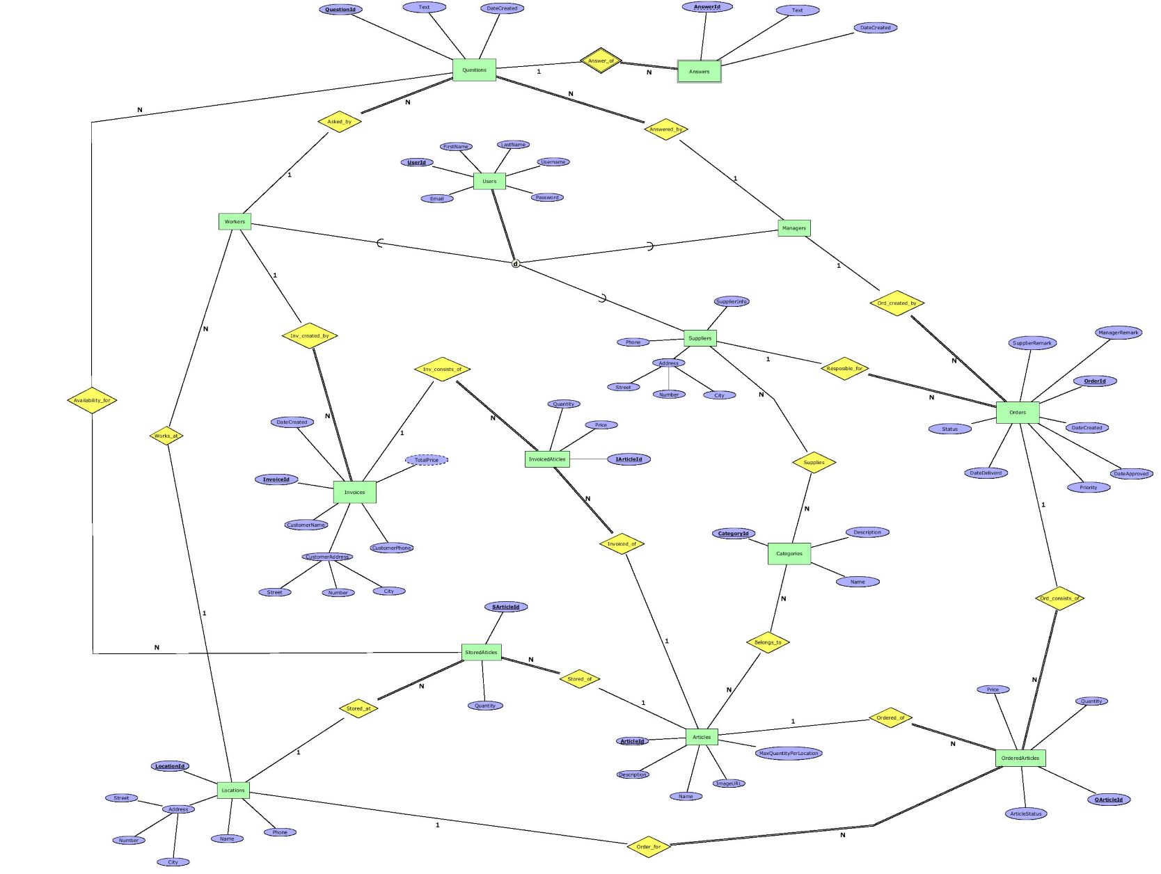 - Верзија 3: Измени направени по консултации со демонстраторот. Слабите ентитети invoicedArticles, orderedAtricles и storedArticles беа заменети со силини ентитети и соодветно беа сменети слабите релации.