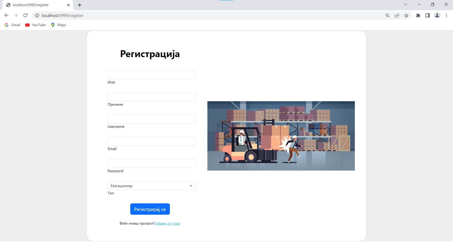 На корисникот му се прикажува формата за регистрација. Тој ја пополнува формата и избира да се регистрира како магационер.
