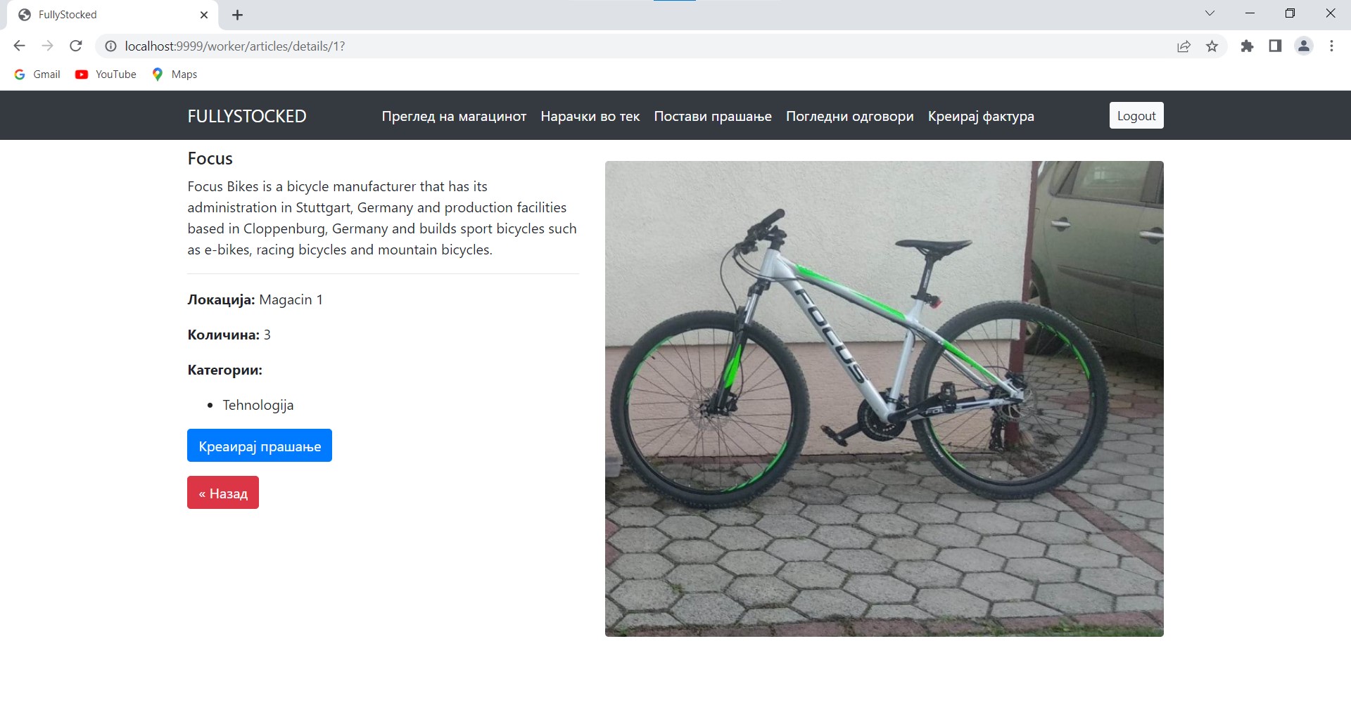 Магационерот избира еден артикл од листата и му се прикажуваат детални информации за избраниот артикл.